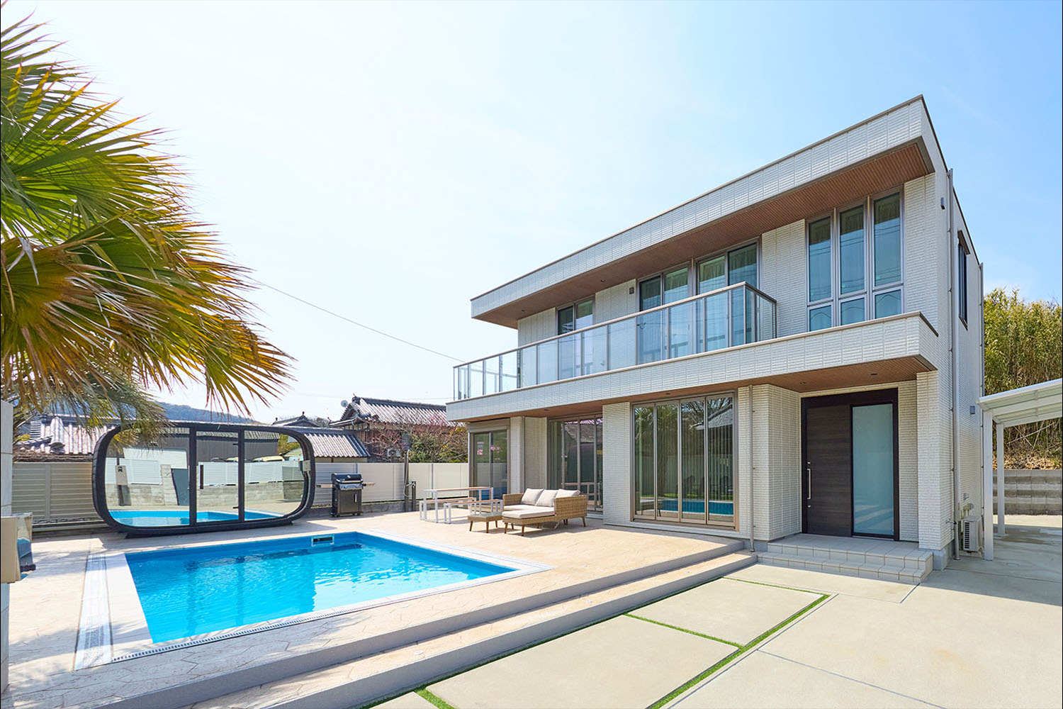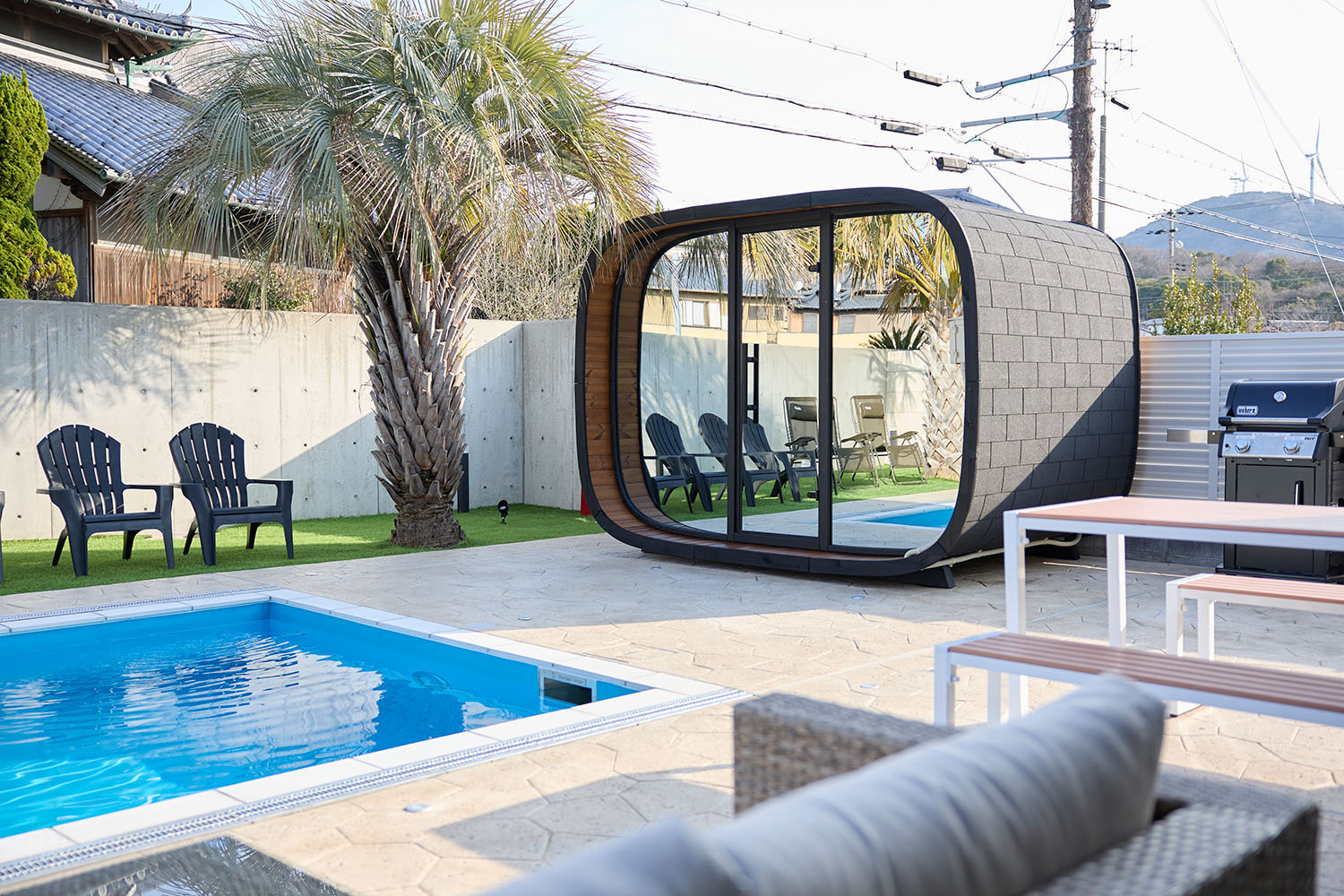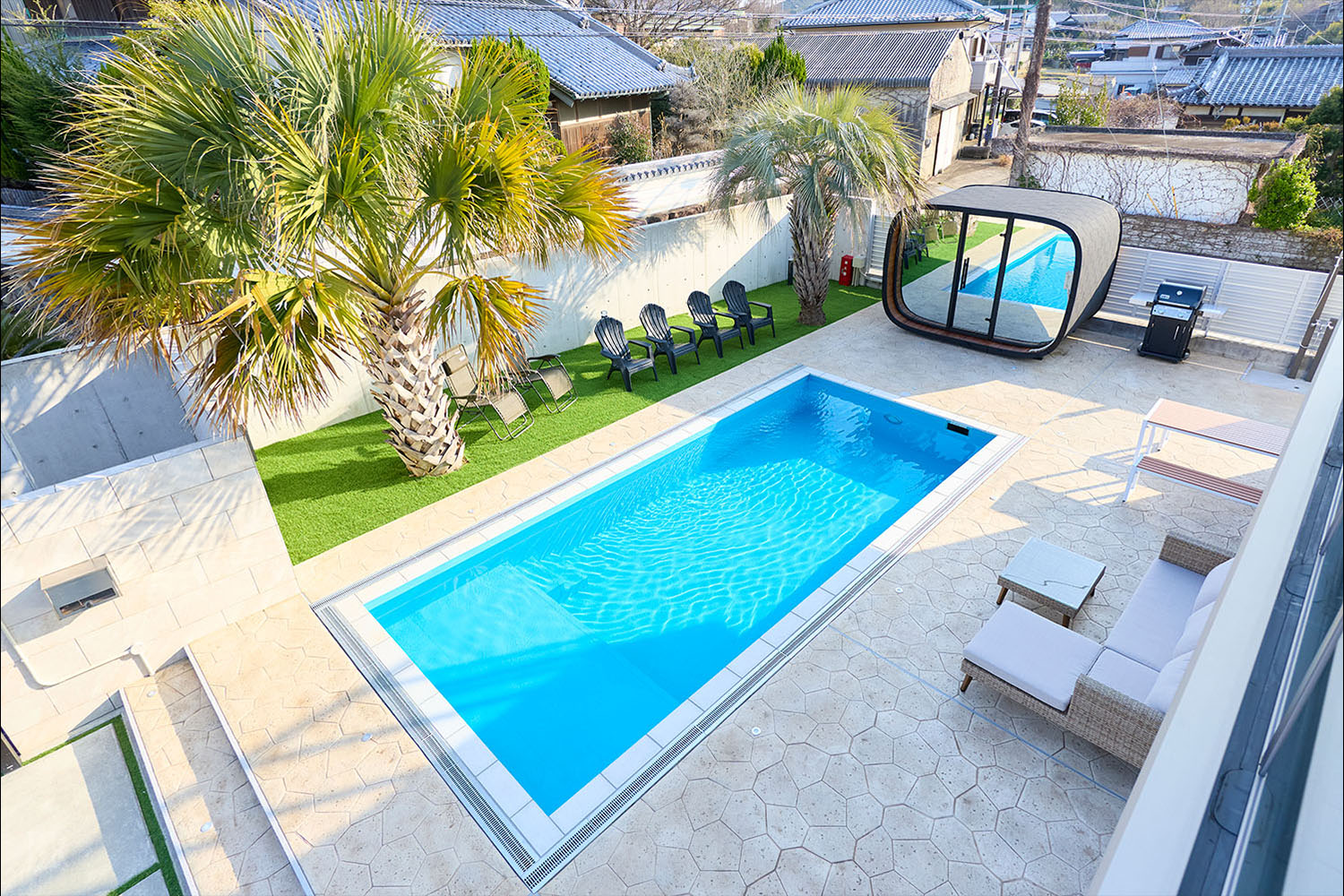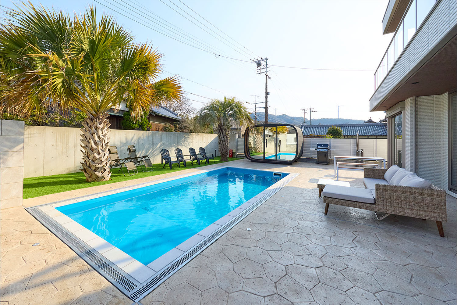 テラスには、ご家族やグループでもゆとりをもって楽しめる大型のプライベートプールを完備。
