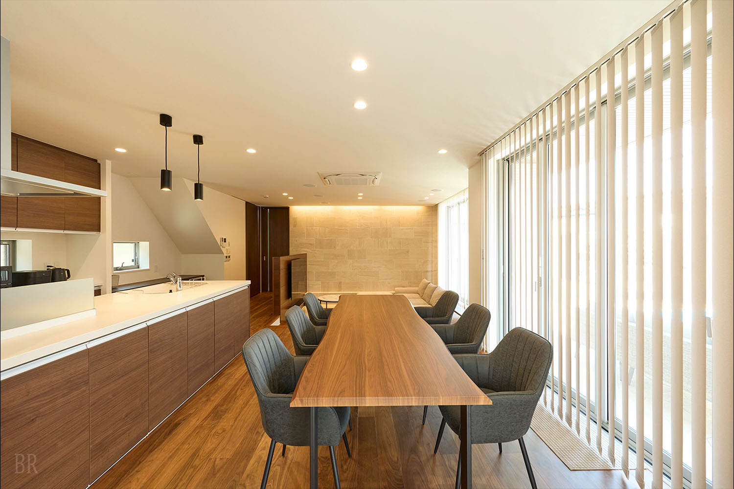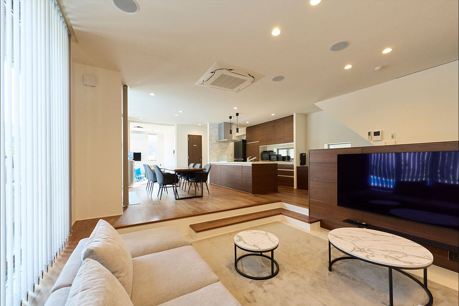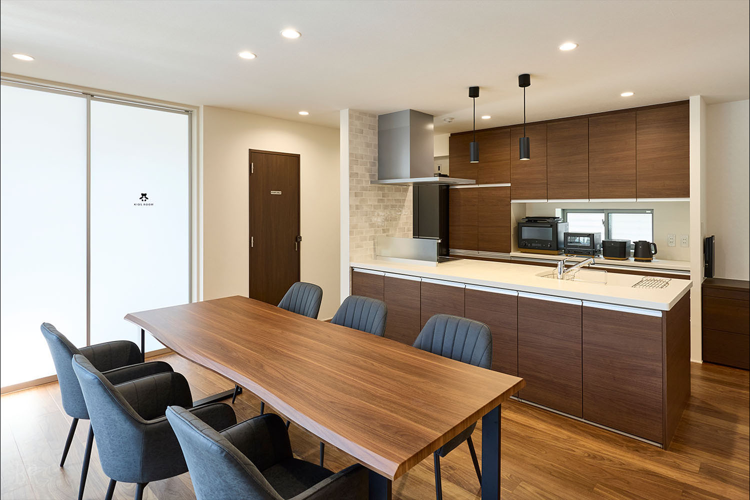 室内には、アイランドキッチン、IHコンロ、冷蔵庫などの設備も充実。