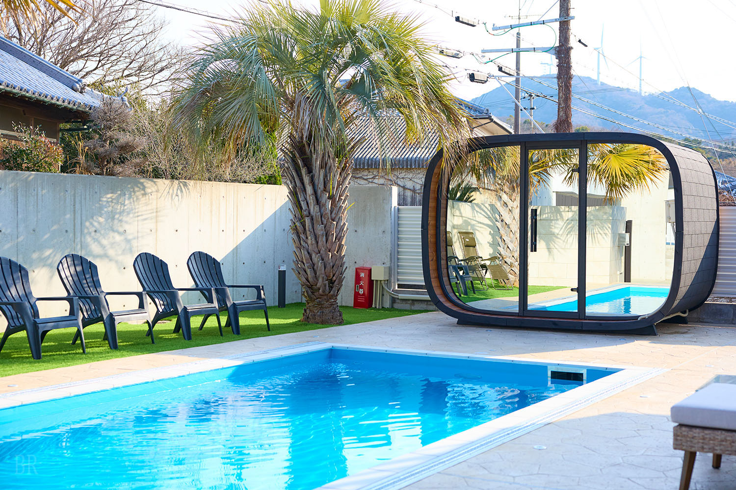 敷地内には広々としたプールとサウナ、